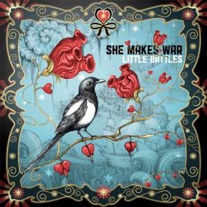 I’ve been waiting with some considerable bating of breath for this album to come along. The first She Makes War full-length was a real revelation for me: accessible, guitar-based music, founded on traditional songwriting virtues, that hits the sweet spot aspired to by writers of prose fiction, and articulates characters whose experiences chime with the listener’s (or my own at least) memory and understanding. Artistic truth, in other words, and in art, truth is beauty. Laura Kidd, whose project SMW is, has thought through the requirements of promoting her own music with a great deal of clarity, and so her work is beautifully packaged, available in a number of gorgeous limited editions, all of which are genuine physical manifestations of her creativity, rather than cardboard boxes with a remix disc inside, as they might be if a record label was in charge of the process. Even if you just download the album from Bandcamp, the cover art is stunning, and in marketing, beauty is truth. There is real sense of coherence about everything that bears the She Makes War imprimatur, from the lyrics, to the video props you can buy from the website, to the production, to the St. Valentine’s Day single released as a limited edition of fifty handmade cards with download codes. This is not just some recordings, attached to some props to persuade us to like it and buy it; it’s a sonic and visual world, which we are invited to enter, and although the music stands admirably on its own two feet, all the other stuff enhances it wonderfully.