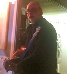 It took me a moment or two to work out that May was specifically performing material from his new book, and that the book took as its subject a specific period of the author’s youth, spent in that hotbed of Bohemian radicalism, Braintree. Seriously, every piece mentioned Braintree: I even had to butt in and ask if he did any about South Woodham Ferrers (another place in Essex that I’ve heard of), but no, they were all about Braintree. ‘All what?’ you may ask, which would be fair enough, since I haven’t said yet. Adrian May’s performance material consists of songs and poems, which bear a certain mutual resemblance, since they share broad thematic concerns (Braintree, for example), and the poems are mostly in regular meter with consistent terminal rhyme schemes. The musical materials he employs are the standard fare of the acoustic singer-songwriter, a long established vocabulary that draws on blues, swing, English folksong and the Arcadian hinterland of pre-psychedelic popular music (his George Formby pastiche sounded entirely in context); he plays plectrum style guitar, without ostentation, but with a good enough command of his technique and language to ornament and comment upon the main thrust of his material; and he plays ukulele and banjo ukelele just as they are meant to be played, with a sprightly sense of mischief.
