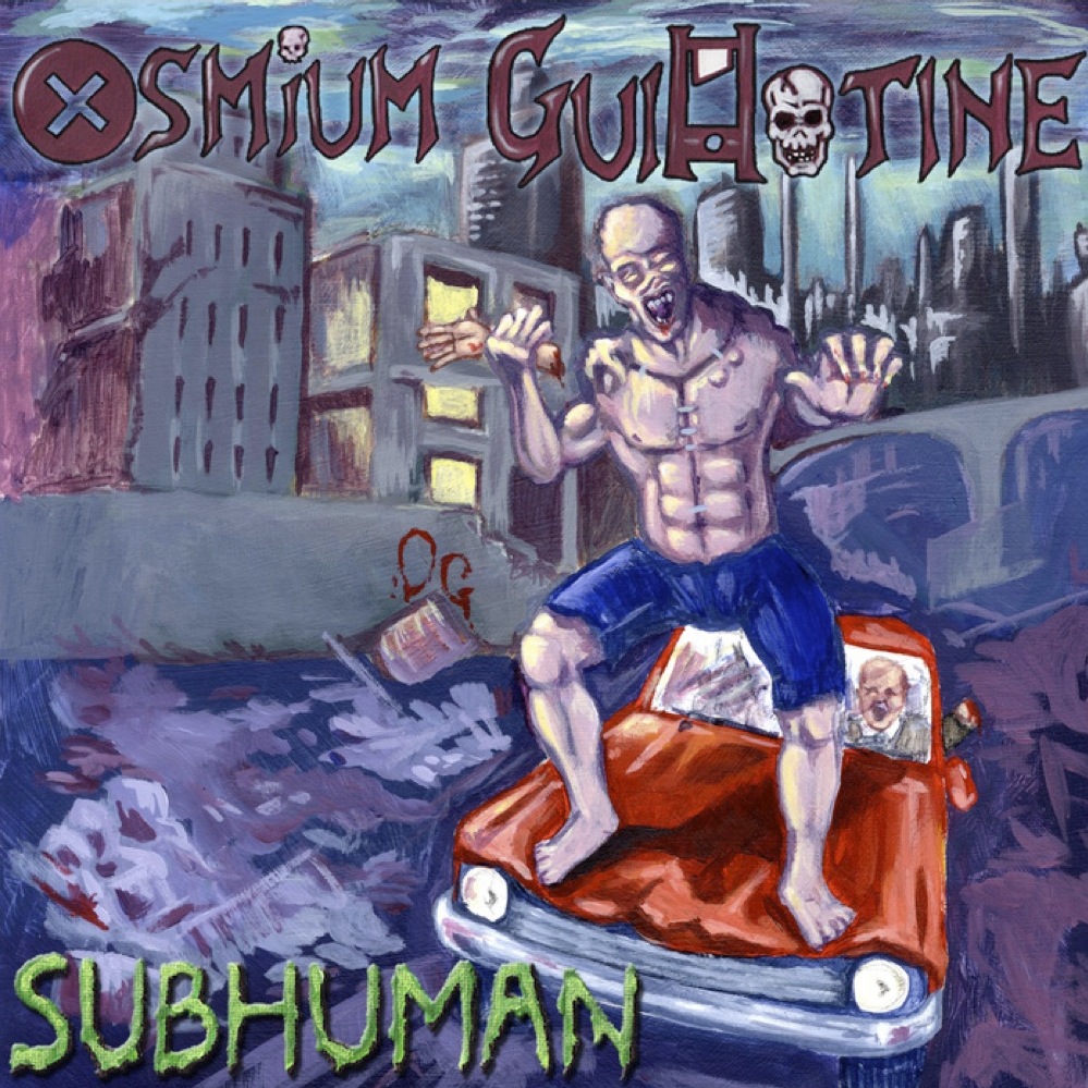 ‘Twisted creations of Satan’s dream’ apparently, this lot. It’s nice to hear a metal band espousing traditional values; although I’ve not been unhappy with recent, more sophisticated trends in the iconography of loud guitar music, it’s nice to know there are still active musicians in love with the rolling thunder of NWOBHM, thrash, and old school punk. What Osmium Guillotine do essentially, is to browse a menu of those influences, and assemble their selections into humorous yet mental slabs of song; they exemplify important virtues such as speed, volume, intensity and heaviness. It is all very old school, but like most such revivalist musics, Subhuman distills more consistent weight and lunacy into the music than was ever actually common in the 1980s. The undead, warfare, real ale and genocide are all important lyrical themes, and all ably served by their musical settings. The playing is perfect pitched to the material, neither too thuggish nor too shreddy to convince, and the included live versions of all five songs (this is really an extended EP) show that they know how to nail it in the heat of battle. Osmium Guillotine play some very enjoyable, very heavy and very entertaining music; they play it very well.