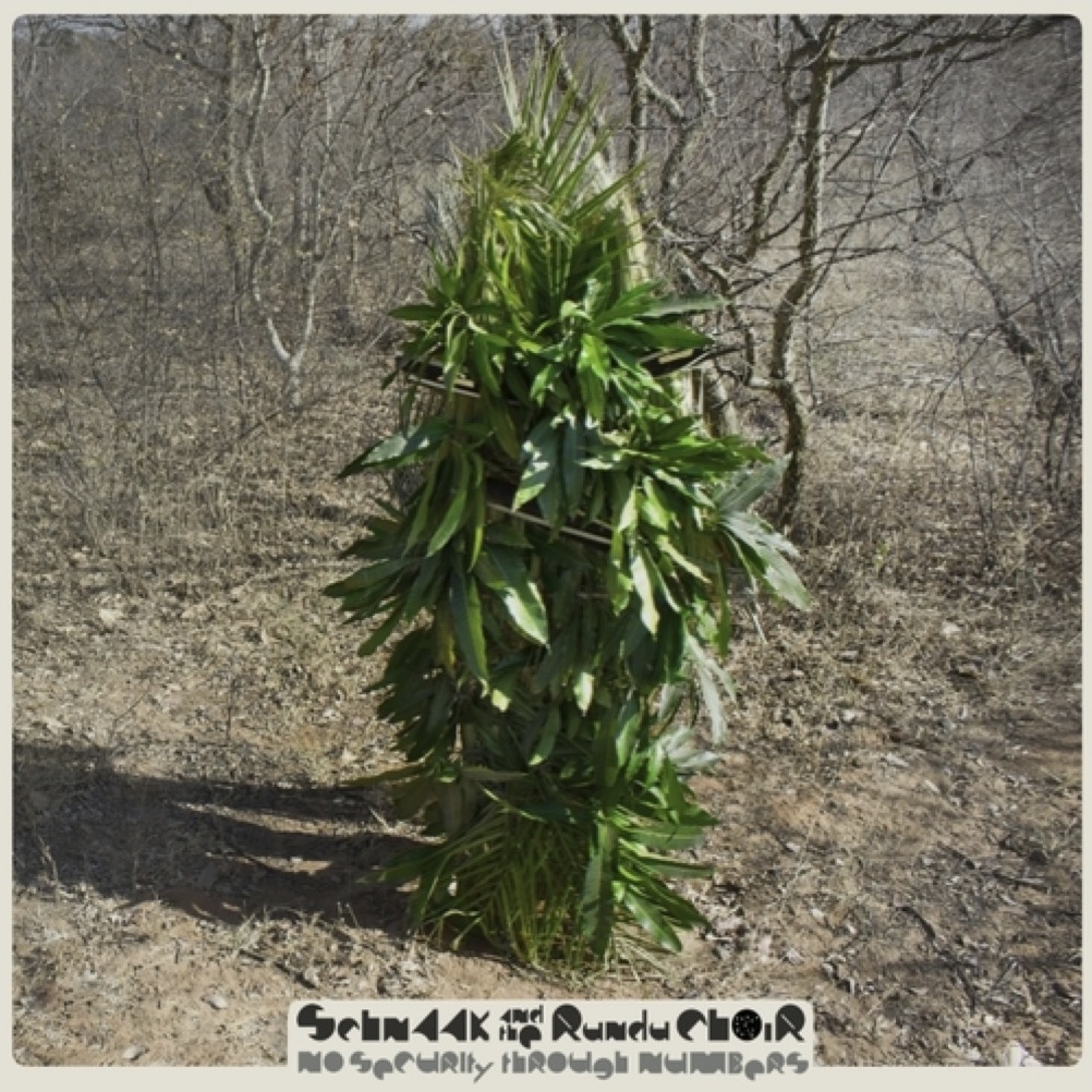 A combination of electro-acoustic and programmed sounds are used here to create a sound that pays clear homage to African polyrhythmic percussion music, unpitched attacks mingling with sounds similar to idiophones or lamellophones, although they might come from almost any source. Then there are the synths, guitars and lo-fi samples… No Security Through Numbers is far too complex to glibly summarise with a juxtaposition of stylistic labels or a list of other bands I think you might have heard of. Towards the end of ‘Super Symmetry’ a series of fusionesque stabs appear as if from nowhere; there has been no indication in the track, or the two that preceded it, that we should expect such an occurrence. Mostly the music is animated by continuous percussion grooves as described above, but that track is introduced by an extended section of slightly gritty melodic drones; ‘Hompa’ features some noisy electric guitar phrases; the release as a whole has a coherent sound, but it is so individual that the first listen through left me continually surprised. It’s frequently quite ‘heavy’, although not via the mechanisms of crunching guitar riffs or brutal sub-hooks; electronic and acoustic percussion noises are unified into powerful barrages of sound, bolstered by a variety of synthesised voices, none of which take the obvious path to aural wish-fulfillment. The sound is, nevertheless, quite accessible, and the rhythms, although often quite abstract, are generally very funky. What this music does not have, which many listeners might expect to find in the company of some of the other elements I’ve described, is vocals, or overarching instrumental melodies. These are the things that locate meaning in European musical culture. These are the discursive statements of the definitive individual voice, the author we are conditioned to seek in all forms of art as the source of its true value; such an idea is absent from much African art, except inasmuch as it has been imported by the processes of colonisation, and this is particularly apparent in music making. African pop music has been exported extensively, and it takes many of its conventions from the North, but even so, it still usually evinces a certain communality of creative effort; folk music is another matter altogether, most notable for the absence of any aurally distinct primary voice. SchnAAk and the Rundu Choir achieve something of that communality; although a duo, they seem to have sunk their individual voices completely into the whole of their music, giving the impression not only that there are more than two of them, but that the two of them are no more important than any of their imaginary friends. This is not only very musical, very pleasing, powerful music, produced with great musicianship, but it is also creatively adventurous work, which seeks to explore avenues to musical meaning that, if not exactly new, certainly depart the comfort zone for most European musicians.