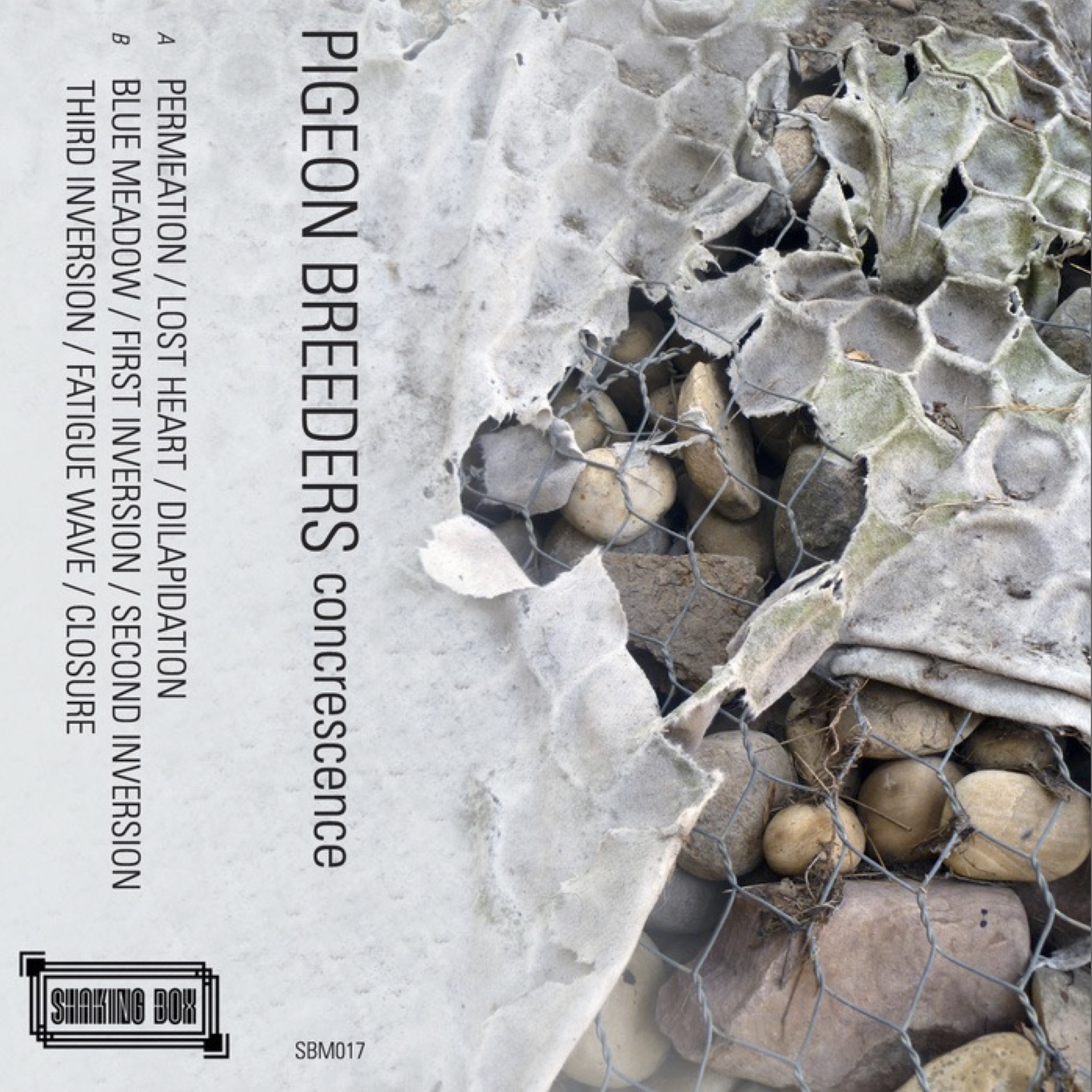 Concrescence opens like the album reviewed above, with the subtle burgeoning of drones, but if you are awaiting a riff, you will be disappointed. This is the electro-acoustic sound of an improvising trio, one which is practised in the elaboration of continuities, seemingly unwilling to slice time for the listener, or to otherwise ease their onrush through it. Instead they tug at our sleeves, like empty-eyed mendicants in a town of the underworld, offering pause, emphasising stasis, but withholding comfort or affirmation. These laminated filaments of sound are not dramatically abrasive or confrontational in character, but they are quietly unsettling, pulsations of percussion reminding the listener of what they have left undone, while the swirling tension of the semi-tonal elements reminds them that they have little time to do it in. This is slow music, and its summons is unmistakeable, but its invitation seems to be to tarry with it while the world we know fades to dust. The trio do not associate their names with specific instruments, on the cassette cover or elsewhere, but percussion and guitar are plainly the predominant voices. Prior to the concluding ‘Closure’ the guitar is not deployed as it often is in drone music, to produce saturated sheets of sound, but emits thin, washed-out swells, or clean, atonal flurries. Where hard attacks are present, as they are in the predominantly scrabbly ‘Second Inversion’, they are used to produce a sense of space, of a disorientating, cavernous environment, in which the listener wanders directionless; or in ‘Fatigue Wave’, layers of rhythm drive inexorably, but they seem to taunt the listener with their urgency, while the booming reverbs in which they swim reiterate the inertia and the oppressive scale of the vast, cold affective volume to which the album as a whole refers. To produce a bleak, sepulchral ambience is relatively easy, and can be done using purely technological means, but to produce one through improvisation is another matter entirely, and the resulting texture is one of great detail and complexity, a vision of human experience rather than a simple stimulus to it. The music emphasises sameness, while becoming continually different; repetition would be too obvious a way to represent the substance of experience, which is irreducibly particular even when it is the experience of monotony and ennui. The paradox at the heart of the album is that Pigeon Breeders are clearly not in any such affective cul-de-sac, but are completely engaged, totally present, focussed and alert, responding to one another in an interactivity as communal as the experience they represent is isolated. This is no contradiction, but the holding in tension of a binary pair, the kind of balanced opposition that we must all negotiate in multiple ways simply to lead our lives (or on a more prosaic level, to physically stand up!). And the texture of the music is not unremittingly shadowed and grim: in ‘Blue Meadow’, amid the disturbed, obsessive scraping, volumes of occlusion shift and stir, and occasionally, for a moment at a time, shafts of light pierce the gloom. It is not a question of the former offering comfort in the face of the latter, and nor does Concrescence position the two in some sort of manichaean struggle: but this music is founded on an understanding that the world is neither this nor that, and that finished, complete understandings and resolutions are chimerae, sought, but never achieved. The tense, unsettling atmospheres of this record are neither comforting nor entertaining, but as the traces of some creatively rigorous and impressively deliberate musicianship they are immersive and they are rewarding. This is a record of rare skill, and rare power.