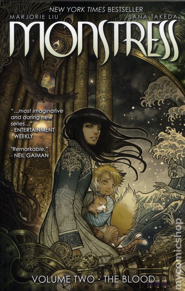 I started reading Monstress for a bit of relief in the midst of researching my masters dissertation – it was vaguely relevant, as I was looking into teratology (the study of monsters) as it relates to the idea of alterity and to fantasy fiction, but mainly it was an easy-to-read comic with pretty pictures. Volume 2: The Blood continues in much the same vein. Sana Takeda’s beautiful art is some of the most decorative you’ll see in a comic: it’s very polished, with a conventional high finish, and while it’s not too generic it is pretty much idiomatic, and adopts a Westernised manga style (big eyes on small cute things, more mimetic on big important things). However, Takeda’s intensively decorated surfaces, and her gleeful rendering of the tale’s more horrific and Lovecraftian elements, give the book a pulsating, darkly psychotropic aesthetic. Marjorie Liu’s script continues to outline the adventures of a young woman with a dark other welded to her being, and it is an expertly paced essay in measured revelation and deepening mystery, peopled with engaging characters and amusing asides (Professor Tam Tam’s pages of explication in particular).
