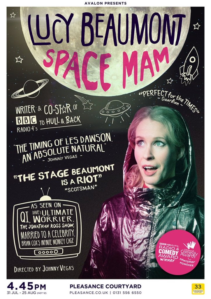 Kingston-upon-Hull is one of those cities that likes to celebrate its dialect. When I first visited, arriving in a small, wooden-hulled, retired fishing trawler, we went to drink off our sea legs at the Minerva. This is an iconic pub overlooking the marina, one of the first sights to greet anyone reaching Hull up the Humber, and between it and the quayside there are a number of decorated benches, possibly installed as part of the City of Culture celebrations which were ongoing at the time. These are inscribed with various items of Hullensian dialect, by means of which the interested visitor can learn to enquire where their interlocutor might be ‘gern on yerolidiz’, or to inform them that they arrived in ‘Ull by bert’, although they could have easily come by car as ‘there’s nur snur ont rurd,’ before they both go back to playing with their ‘ferns’. Although Lucy Beaumont’s accent is far from broad, we were only a couple of sentences in to Space Mam, her show on this year’s Edinburgh Fringe, before I realised she was a Hullensian.