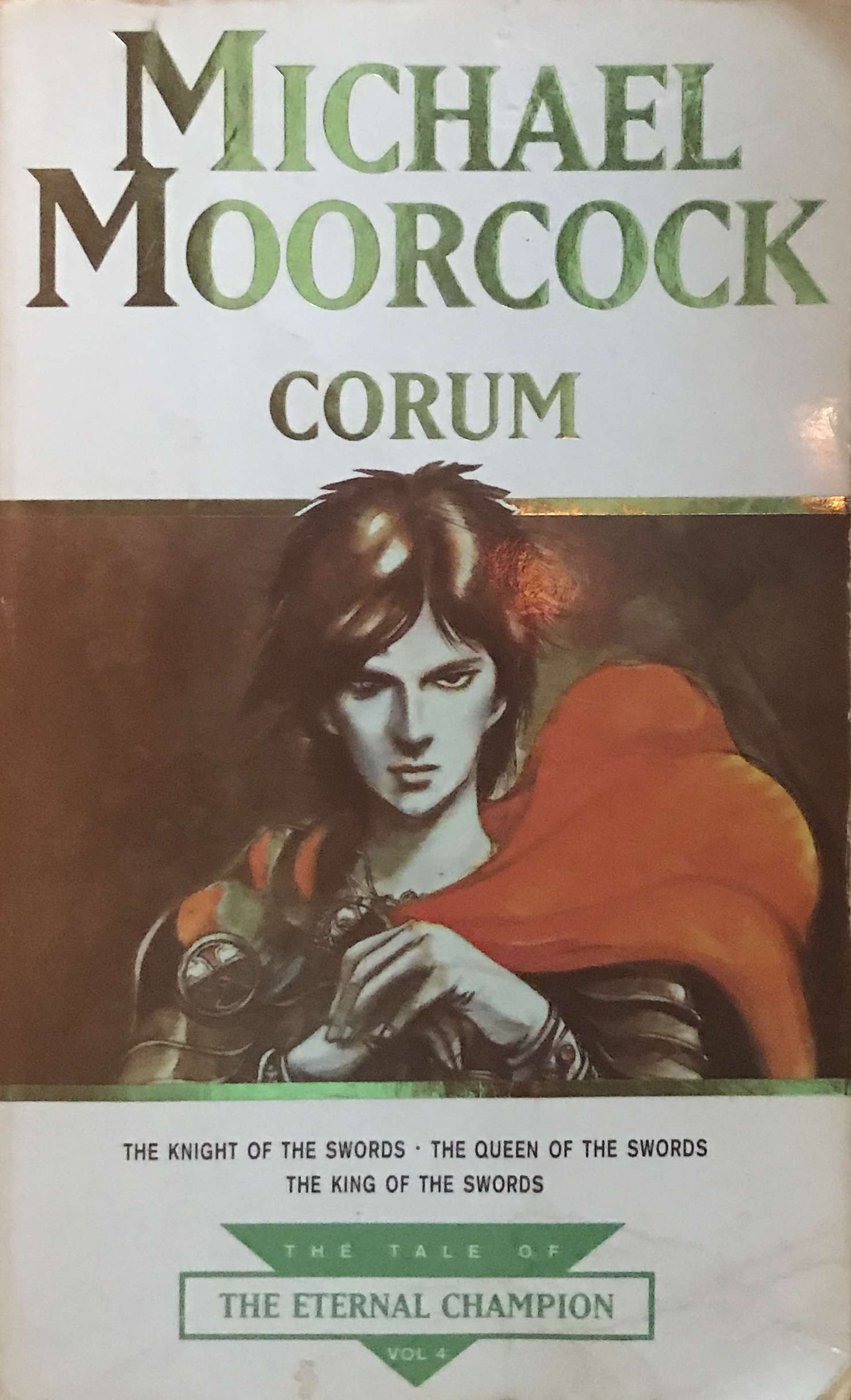 Corum Jhaelen Irsei is one aspect of the Eternal Champion, and the subject of two trilogies of Moorcock’s down-and-dirty, pulpy-yet-smart sword-and-sorcery novels. These stories are rarely constructed with great care or detailed planning, but spring fully formed from Moorcock’s febrile imagination and leap into lurid unreality at the touch of his fingers on the typewriter keyboard. They are not intended to be read with great care or reverence, and they are written with visceral, improvisational aplomb, in much the way that a blues rock guitarist grinds out a solo from their repertoire of licks and riffs. However, as the opening paragraphs of this discussion may suggest, a great deal of preparatory thought and off-stage erudition informs the seemingly casual execution of the published texts.