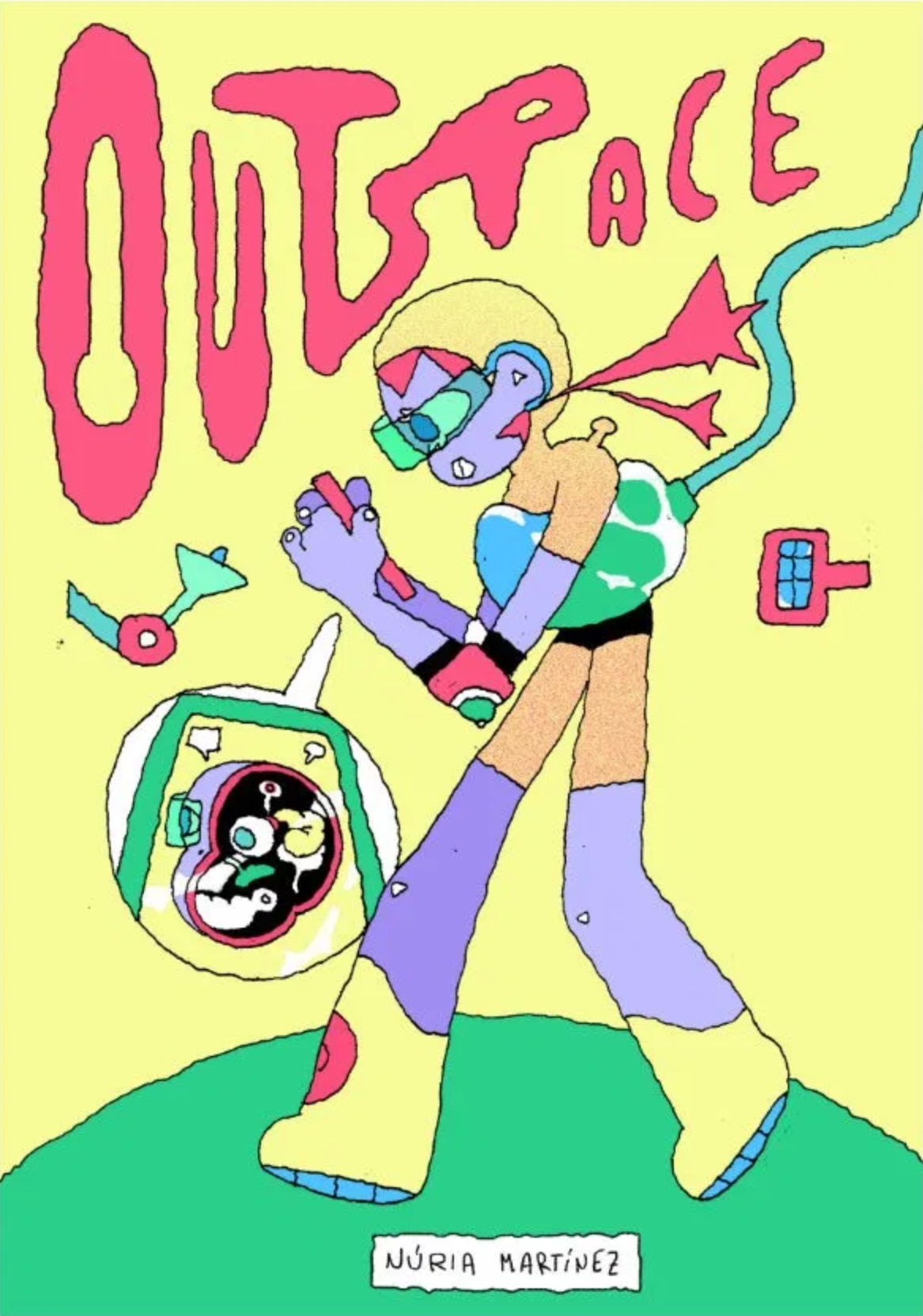 Nuria Martinez cultivates a self-consciously naïve cartooning style, but her sophistication as an illustrator, and her narrative facility as a comics artist become quickly apparent from the outset of Outspace, her cute, colourful one-shot for ShortBox Comics. An upturned roller-skate in the fourth (or third?) panel of the first page transforms something that apes the surface qualities of a child’s crayon drawing into an unambiguous representation of motion in space. On page 6 the protagonist Erin looks back over her shoulder, again in what appears to be a crudely assembled set of flat coloured shapes, in a way that conveys precisely her movement, her physicality, her body language—the narrative significance of the panel is as transparent as Martinez’s pages are decorative. Or look at the cover: the psychedelic, abstracted form that strides from right to left is not conventionally mimetic, but there’s no difficulty identifying the slim red oblong in her hands—the characteristic smartphone hunch is unmistakeable.